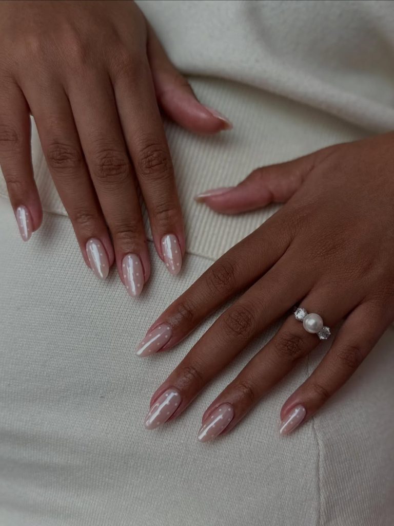 Translucent pink veils the nail while slim white dots cascade down like first snow. The shape leans slim almond, balancing romance with restraint.