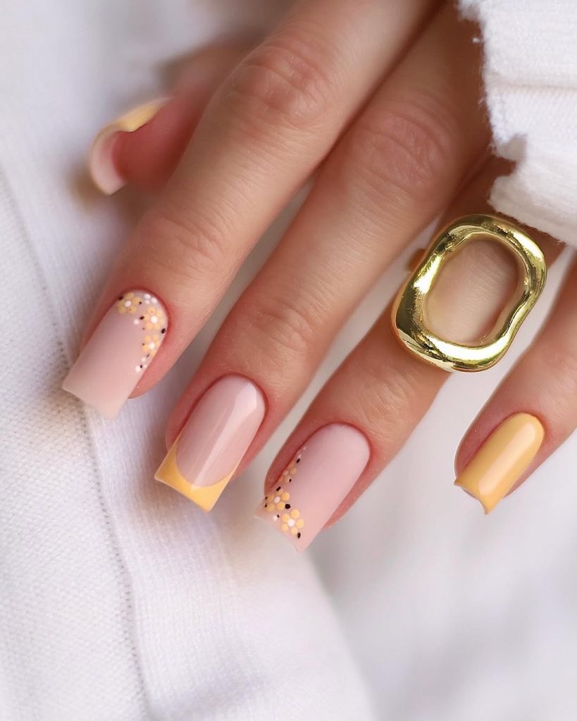 Pastel-butter tips meet nude-peach polish on a tidy square silhouette; scattered micro-flowers and dotting give it a couture-cupcake moment—sweet, not saccharine.