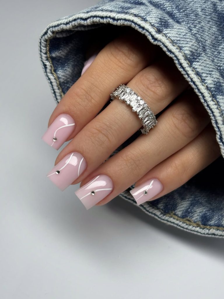 A ballet-pink base, mirror-gloss topcoat, and thin white contour lines topped with a single silver stud per nail. Short-to-medium square length keeps it city sleek.