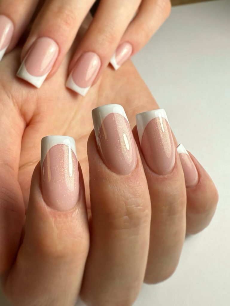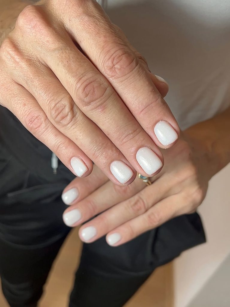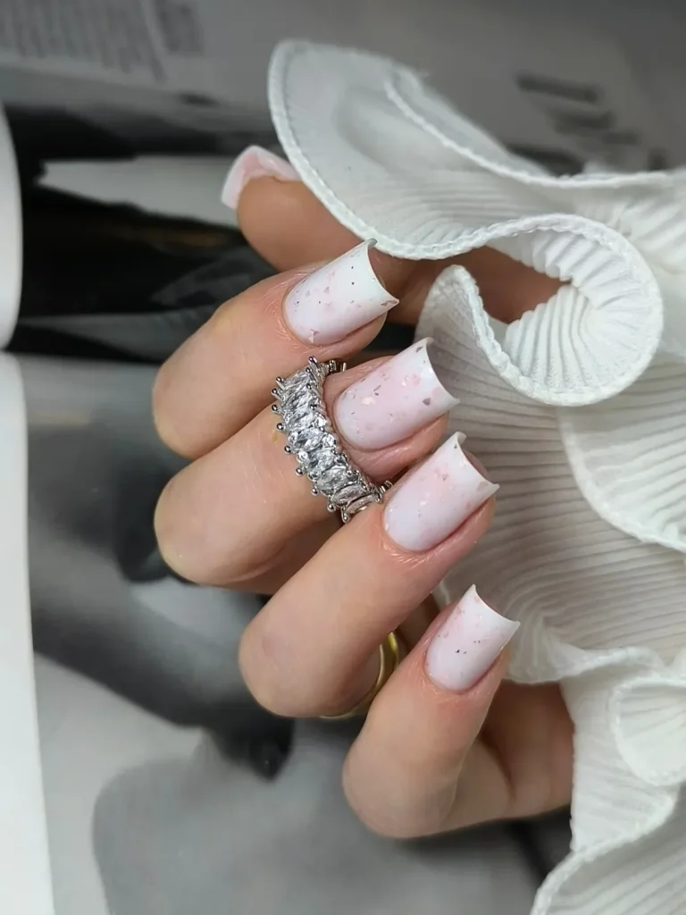 Milky white fades into a whisper of blush on neat short square nails, dusted with tiny tonal speckles—like fresh snow settling on satin. The edges stay crisp and the finish ultra-glossy, which is why this reads so clean and effortlessly classy.