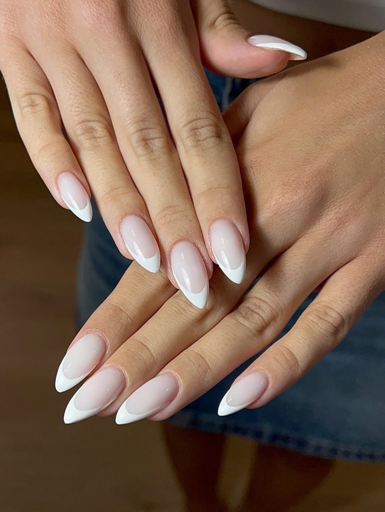 A translucent pink base meets crisp, high-contrast tips on elongated almond points. The smile line is sharp, the finish glassy—an ageless French reimagined for 2026.