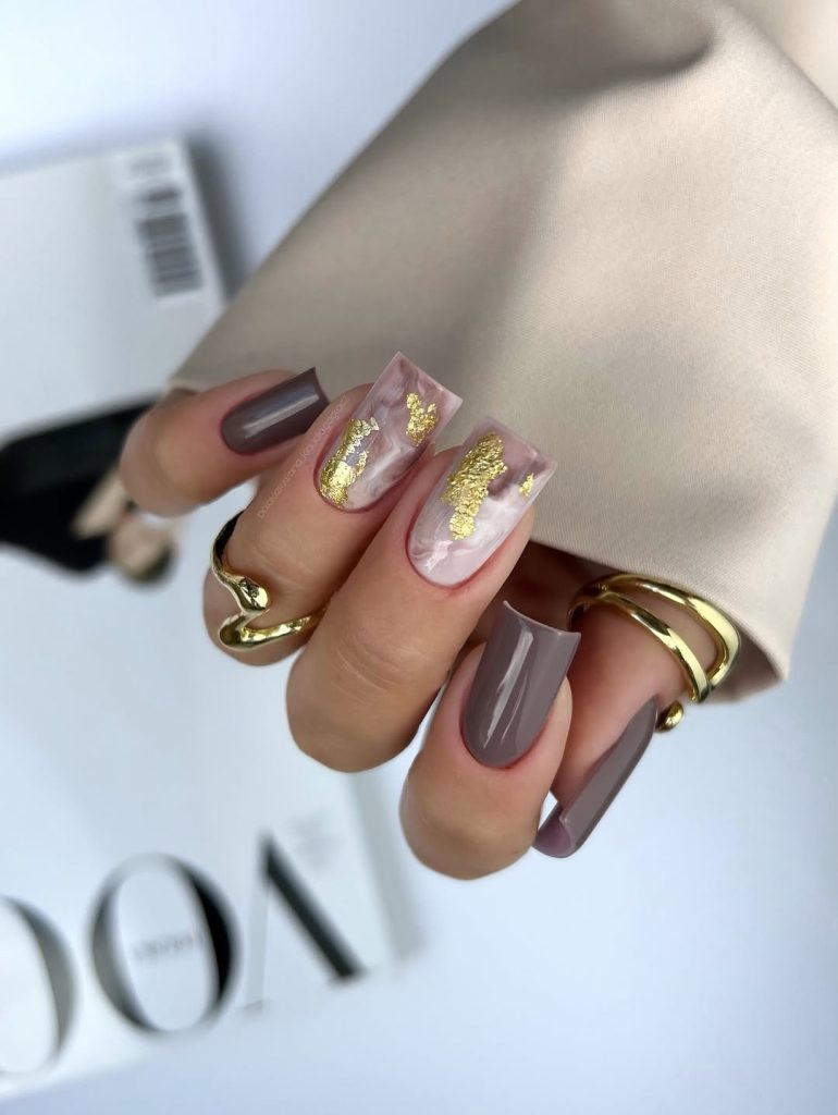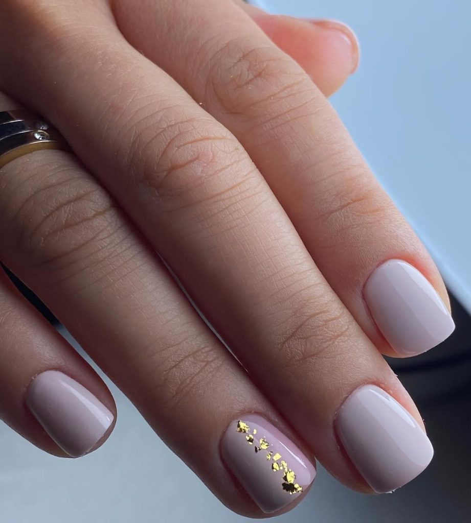 A refined, cashmere-beige polish on short, softly square nails with a single accent of irregular gold foil along the sidewall. It’s quiet luxury embodied: minimalist base, editorial detail.