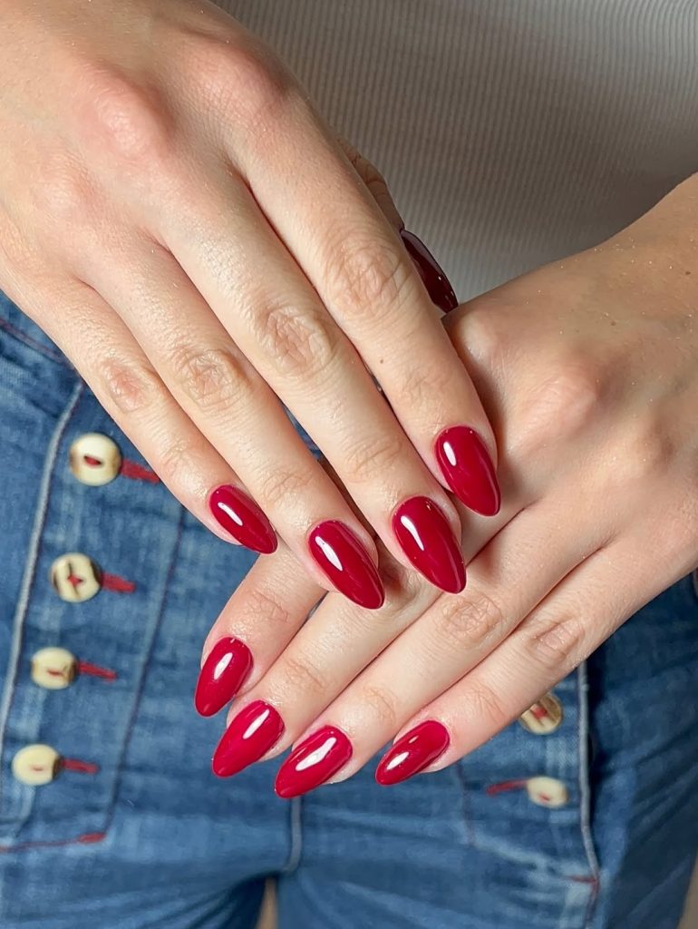 High-gloss cherry red on medium almond nails—glamorous without being fussy. This tone flatters every skin tone and looks fantastic wrapped around a latte cup or a clutch.