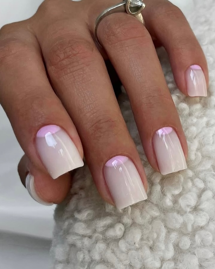 A milky neutral base topped with a translucent bubble-pink half-moon near the cuticle on tidy short square nails. Fresh, youthful, and delightfully glossy.