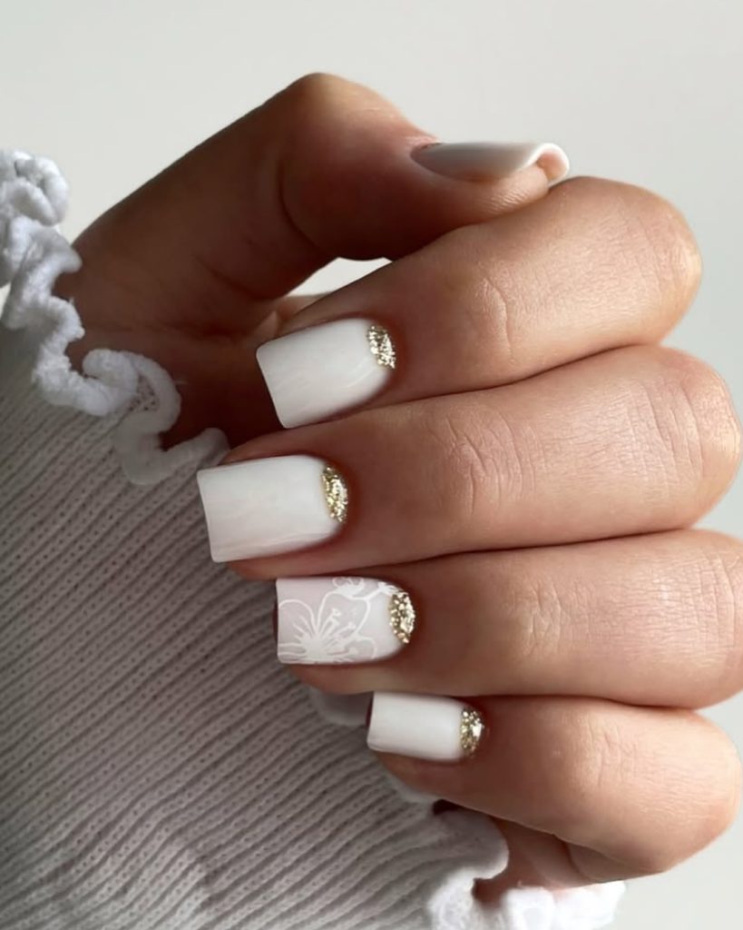 Snow-white polish on square Gold shimmer at the cuticle. One nail features a barely-there floral outline—like lace on a silk slip.