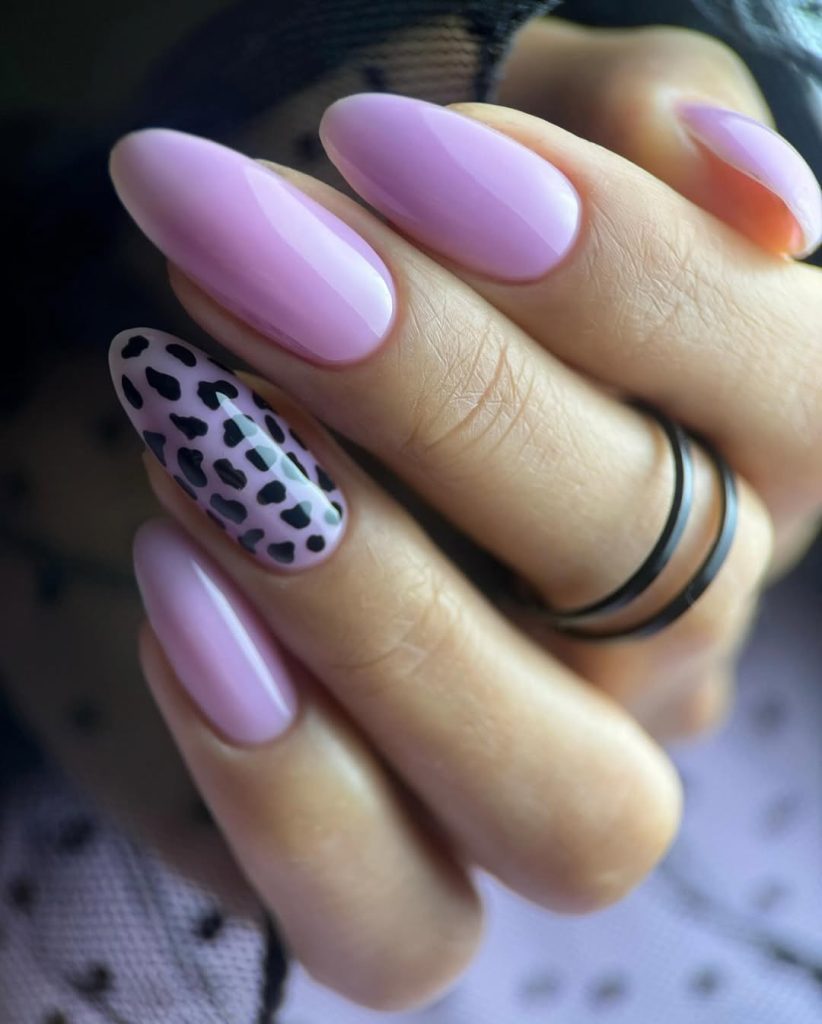 Glassy orchid-pink across most nails, with a single accent showcasing soft-edged leopard spots on a blush base. The shape stays softly almond—feminine with a wink.