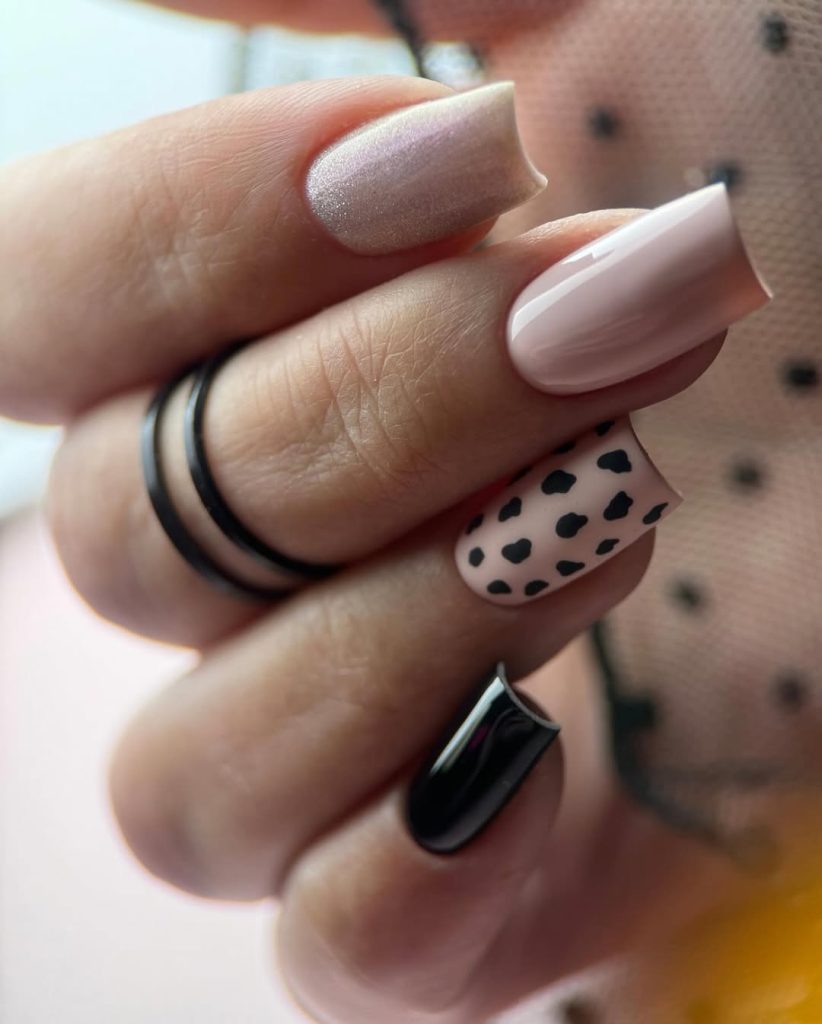 A curated cocktail: pearly champagne, soft nude, blush leopard, and one glossy black nail. Short-to-medium square length keeps the palette sophisticated rather than fussy.