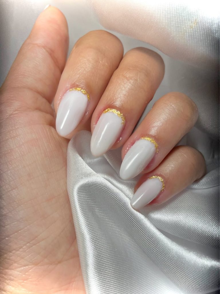 A porcelain-white gel washes over softly tapered almond nails, finished with a whisper-thin arc of micro gold shimmer hugging each cuticle. It’s the manicure equivalent of fine jewelry—subtle, luminous, and unmistakably classy.