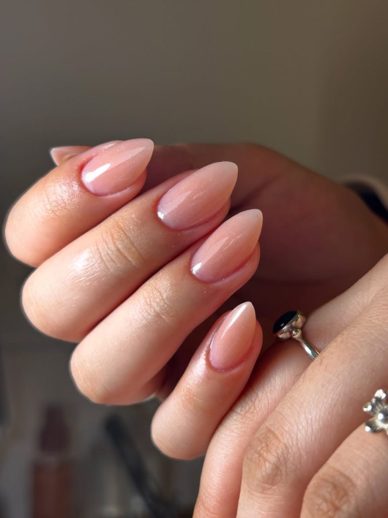 A translucent peachy nude—think lip oil for nails—glossed over medium almond tips. The result is healthy, glassy, and quietly expensive, the kind of manicure that looks perfect in natural light and boardrooms alike.