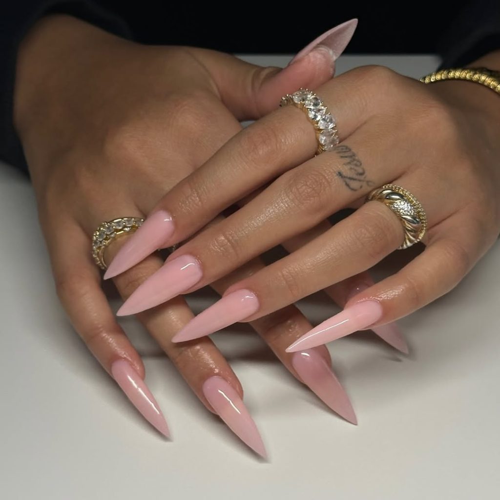 Hyper-glossy, ballerina-pink stilettos stretch the hand like satin heels for your fingertips. The length brings pure drama, and the shade stays soft and romantic—celebration nails that still feel classic.