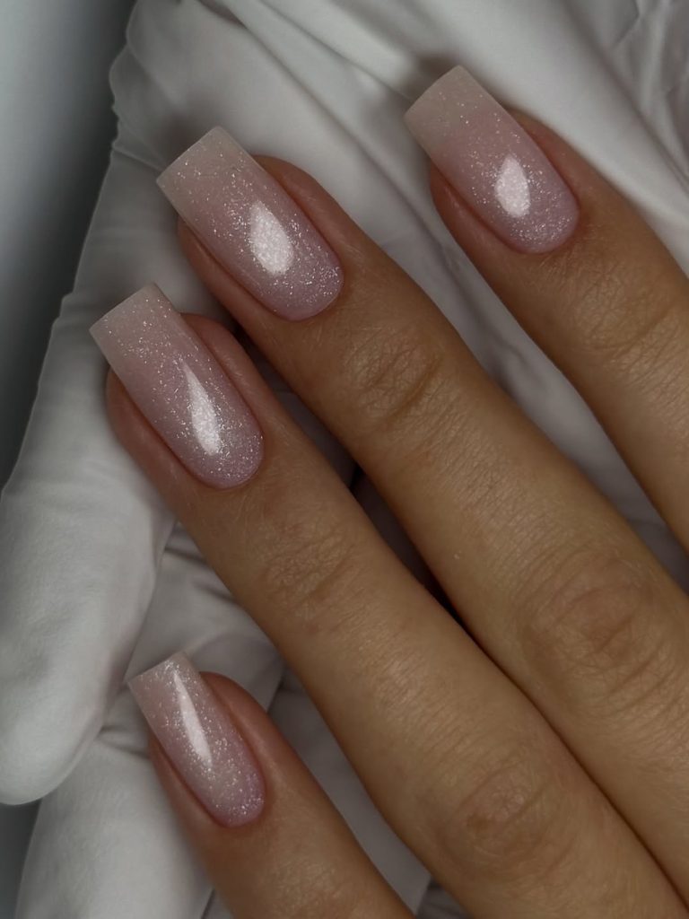 A veil of micro-shimmer fades from rosy cuticles to soft-white tips on elongated square nails—the most photogenic iteration of the “baby-boomer” gradient.