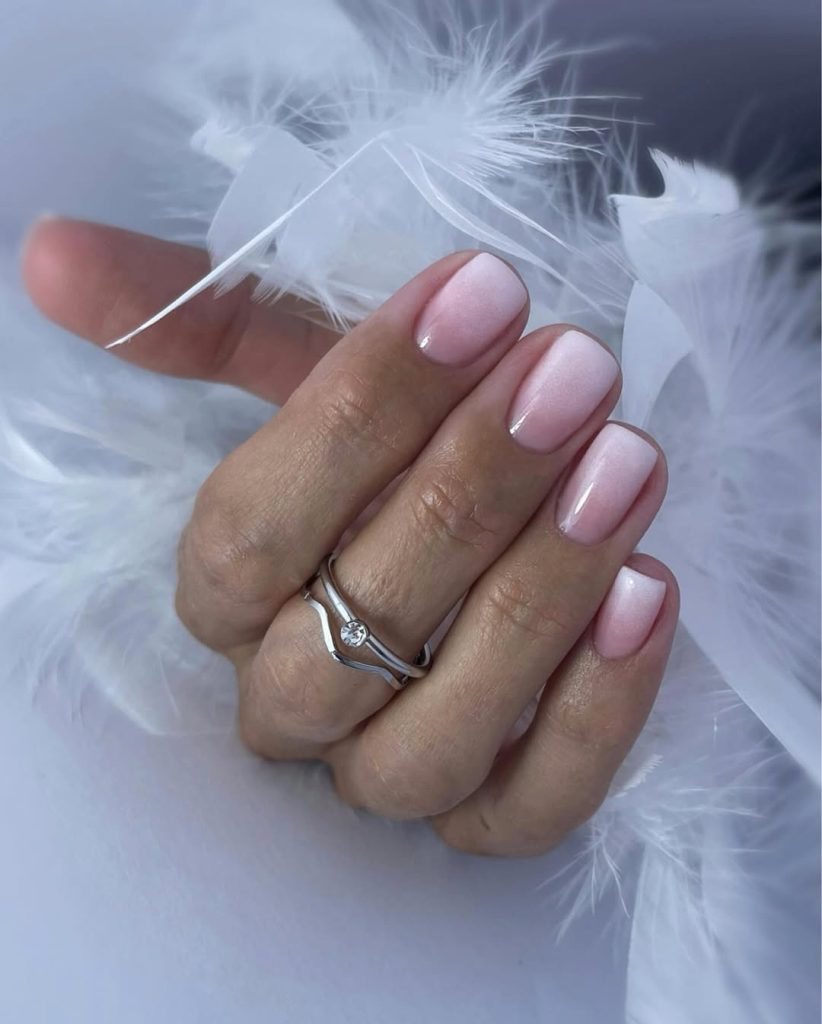 A soft, feathery gradient of ballet pink on short, rounded-square nails—quiet luxury you can type in. The glow looks like good skincare for your hands.