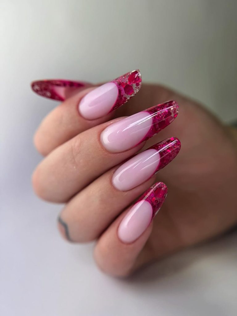 Raspberry-pink, crushed-foil tips arc across a sheer blush base on long almond nails. The smile lines swoop dramatically, leaving a soft oval of negative space at the cuticle—high-gloss and couture without going overboard.
