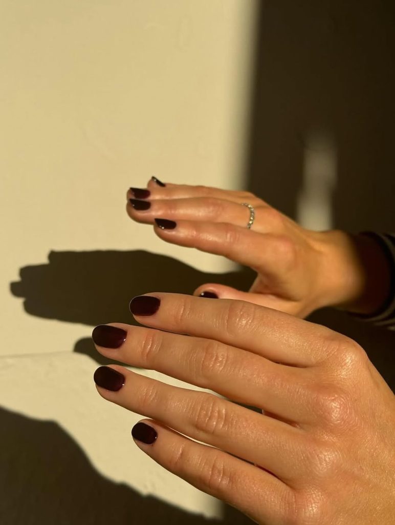 A deep merlot lacquer on neatly filed, rounded short nails—sophisticated and moody. The shade hits that sweet spot between office-appropriate and after-hours dark drama.