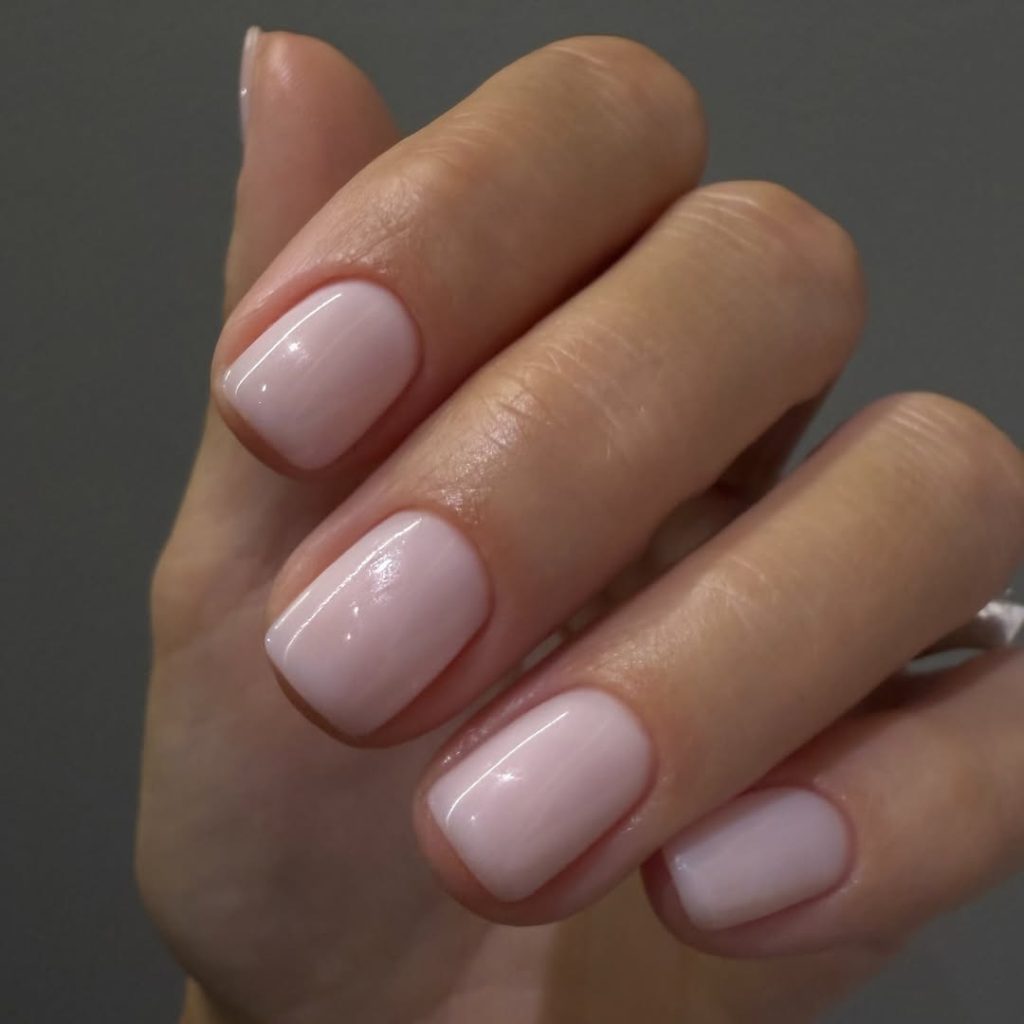 Translucent ballet pink softly blurs the nail plate on a tidy square silhouette. It reads like skincare for your hands—fresh, healthy, and quietly luxe.