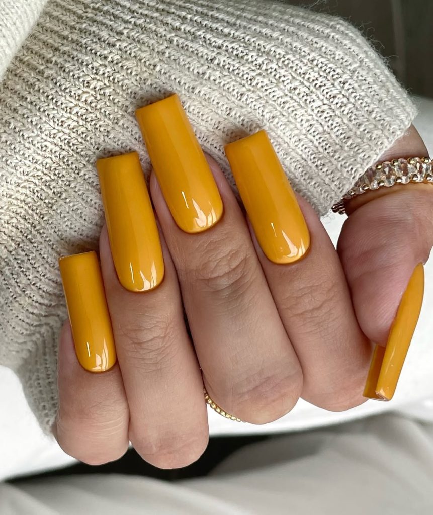 A marigold crème saturates long square nails—joyful, confident, and tailor-made for selfies. The high-shine finish gives fashion-week energy with sweater-weather warmth.