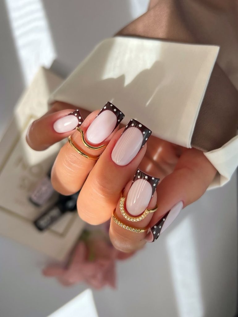 Milk-glaze with French tips in chocolate-brown and white polka dots; one nail breaks the monotony with a dotted half-moon. The gently oval/almond silhouette keeps it chic, not cutesy.
