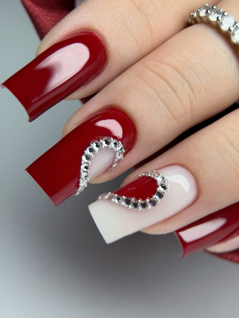 High-shine garnet wraps around bright ivory in sweeping S-curves, outlined with petite crystals on long square nails. It’s show-stopping but balanced—holiday-party drama you can still text with.