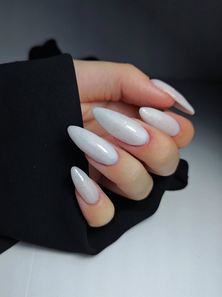 A cool, moonlit grey-white with micro-sparkle coats tapered almond nails. The glaze is translucent enough to feel airy, yet reflective under evening lights—quiet luxury for every season.
