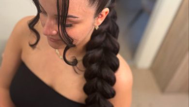 This version relaxes the rules: a coiled bun at the nape with one soft piece left out to skim the cheekbone. It’s romantic without being fussy, the kind of hair that looks incredible with a slip dress or an open-back sweater.