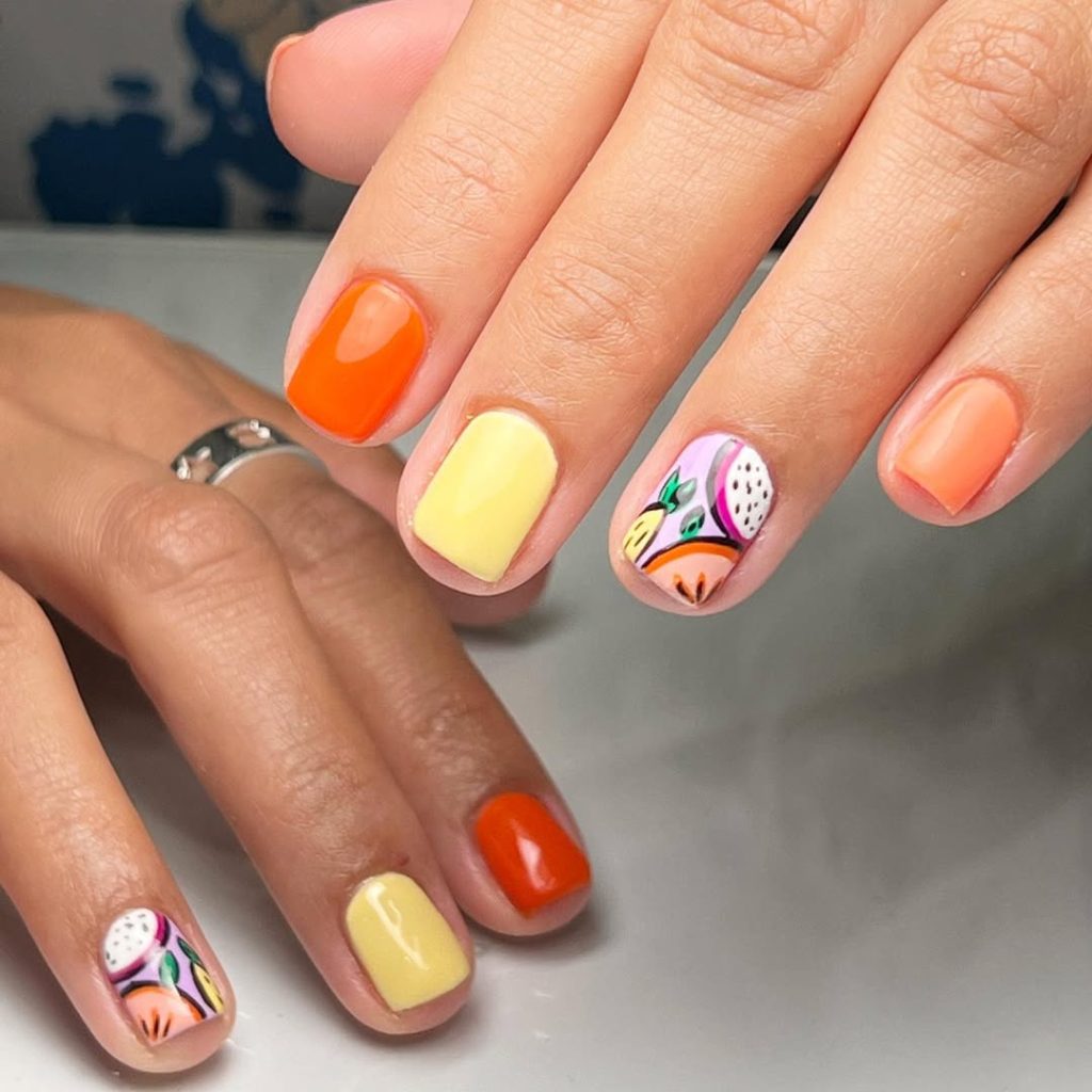 Citrus Pop + Fruit-Market Accent on Short Square Nails