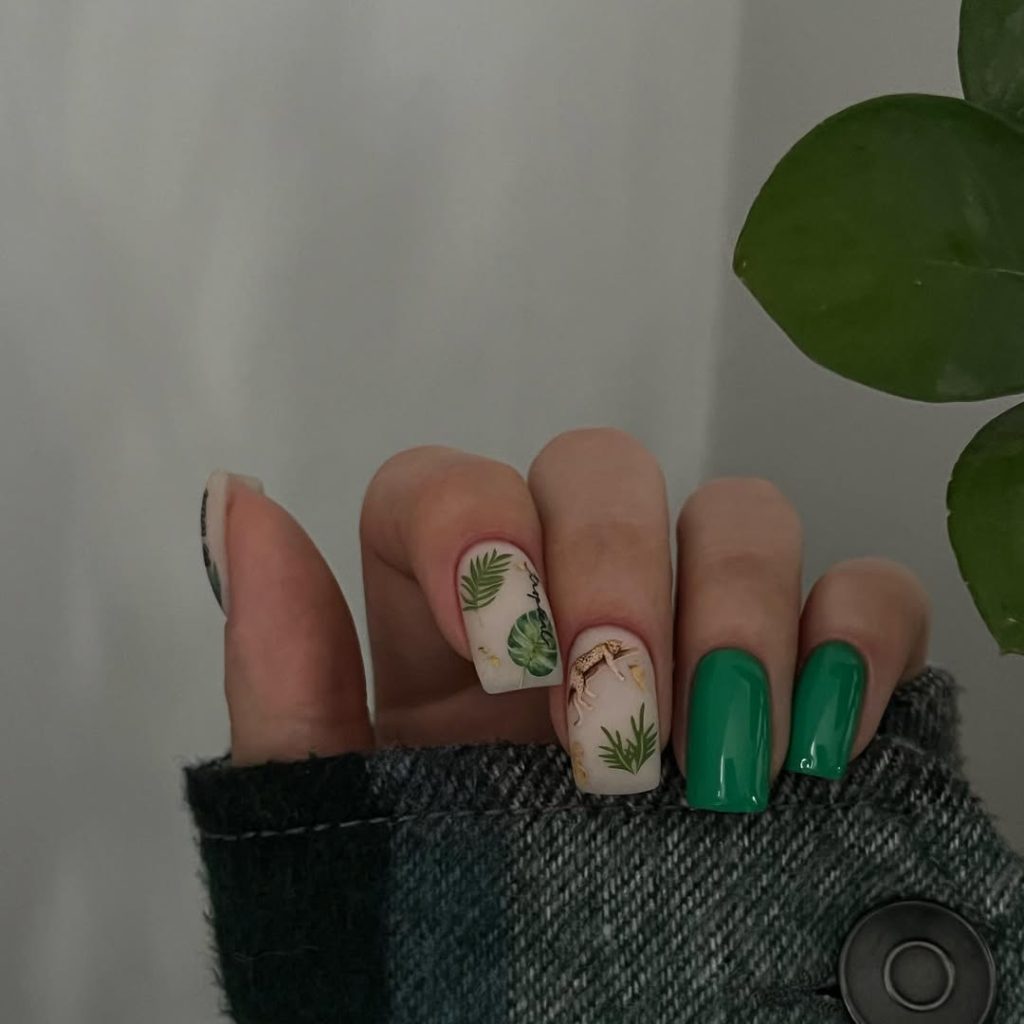 A deep, glossy green takes the lead here—bold, moody, and surprisingly sophisticated. The accent nails balance it with a soft neutral base, layered tropical leaves (palm and monstera shapes), and a tiny lizard motif that feels like a subtle wink rather than a costume. It’s giving tropical greenhouse meets cool-girl minimalism.