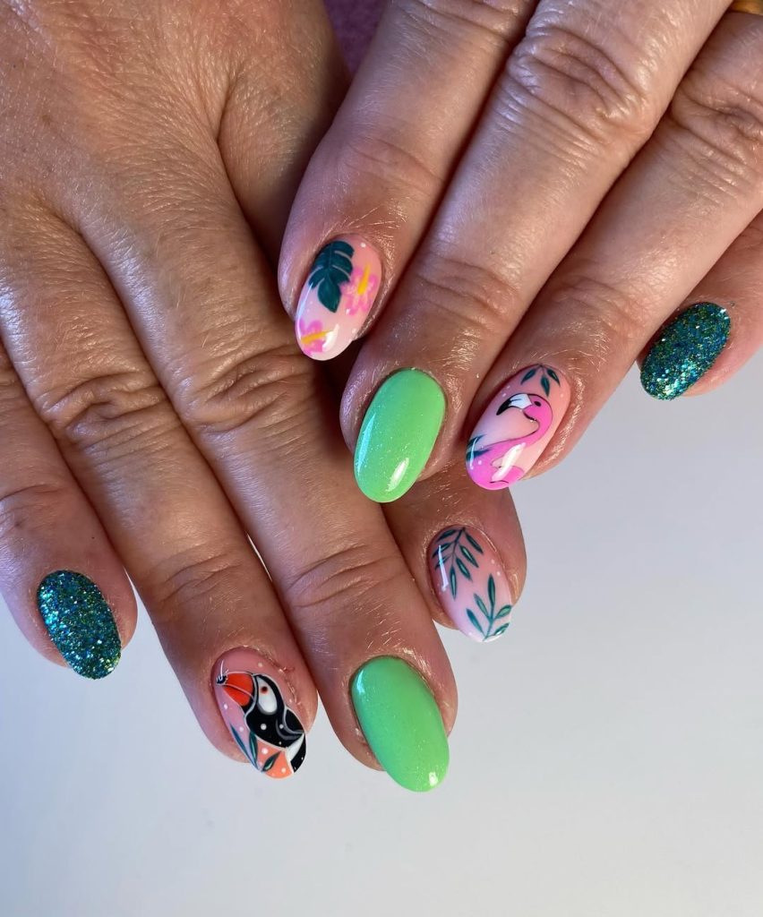 Flamingo and Toucan Nail Art with Tropical Glitter and Lime Shine