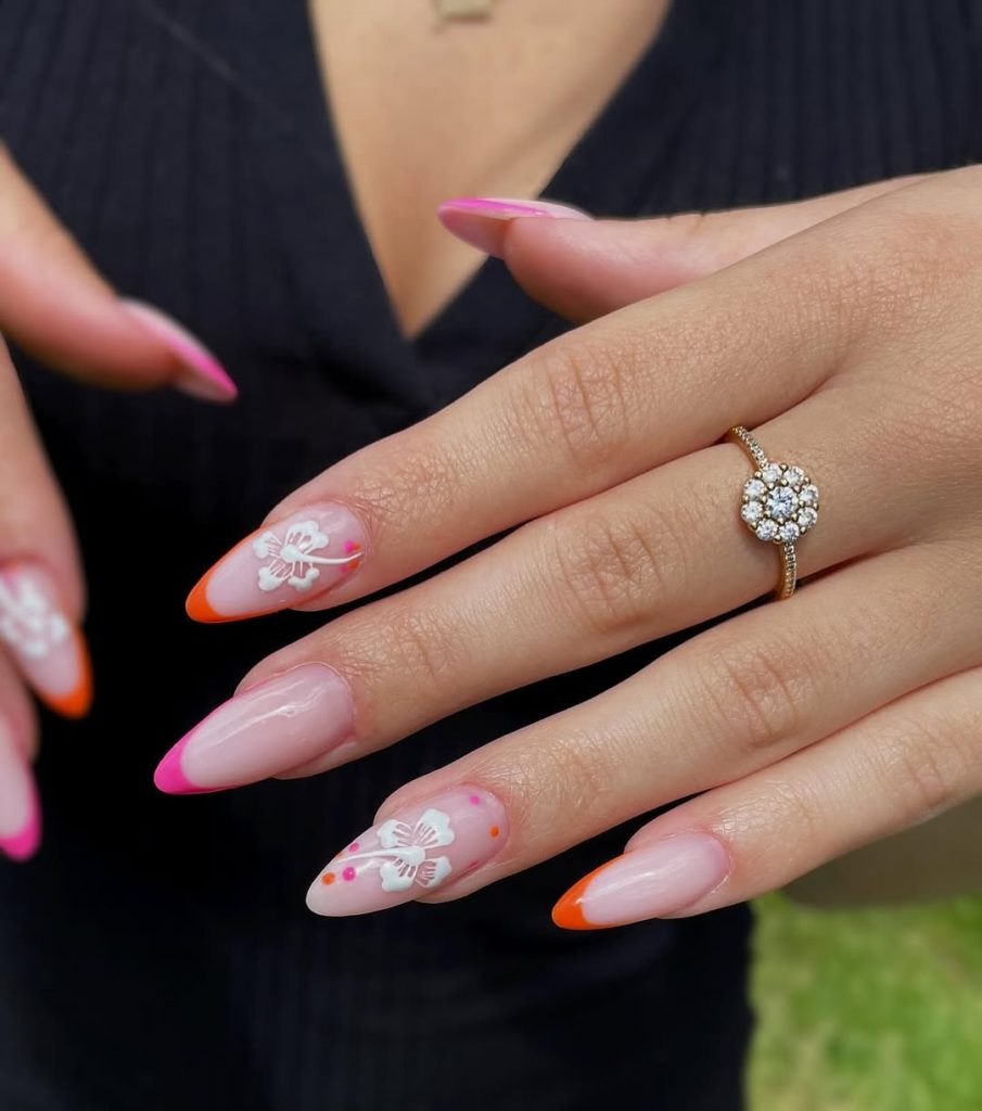 If “tropical” could whisper instead of shout, it would look like this. The base is a sheer milky nude, topped with hot pink and orange French tips that feel modern and clean. Then come the hibiscus flowers—white petals with tiny pops of neon dotting, like confetti that landed perfectly.