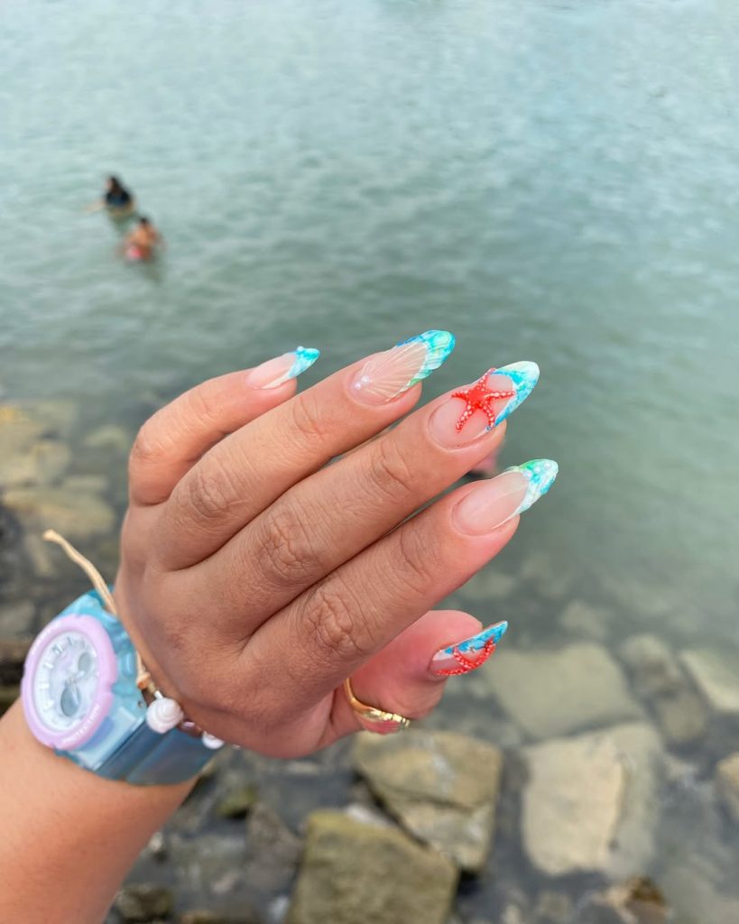 This is the manicure equivalent of standing at the shoreline right before sunset. The tips look like waves—marbled turquoise and blue with a watercolor feel, staying translucent enough to keep the set airy. A bright red starfish detail adds the perfect punch, and the shell accent brings a soft, coastal romance.