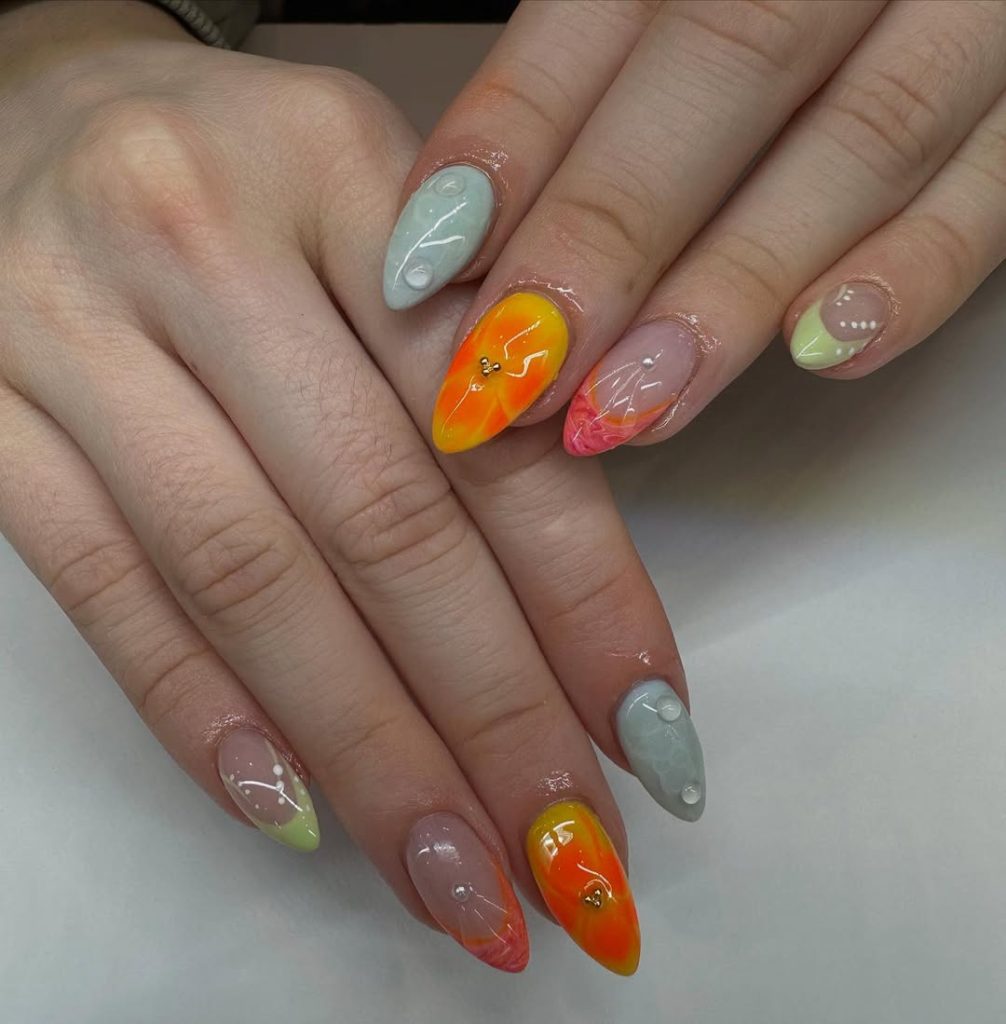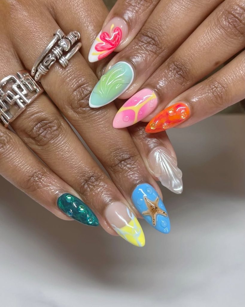 This manicure is a tropical candy shop—with a beach twist. Each nail has its own personality: translucent orange with bubble-like droplets, a cool teal “underwater” effect, soft pink and yellow swirls, a minty embossed leaf, and a bright blue nail featuring a starfish accent. The clear shell detail adds a glossy, ocean-inspired texture that feels modern and editorial.