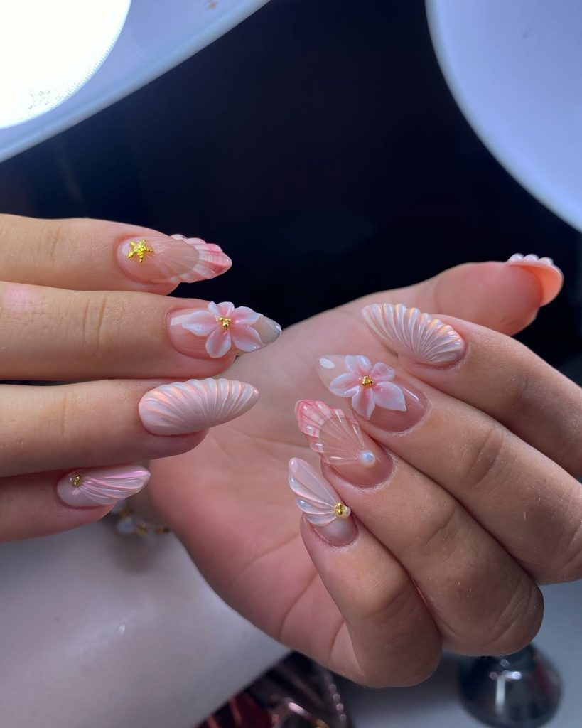 Here’s the “mermaid, but make it grown” take: translucent blush bases, pearly shell ridges, tiny gold details, and petal-soft 3D florals that look hand-sculpted. The light-reflecting finish gives that beachy glow without needing glitter overload. It’s romantic, slightly dreamy, and still wearable—especially if you love elevated designs for beach vacations.