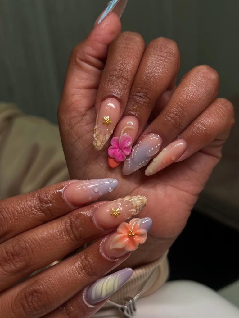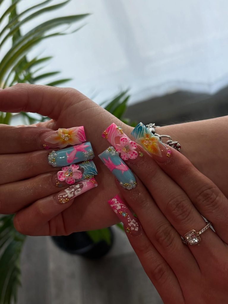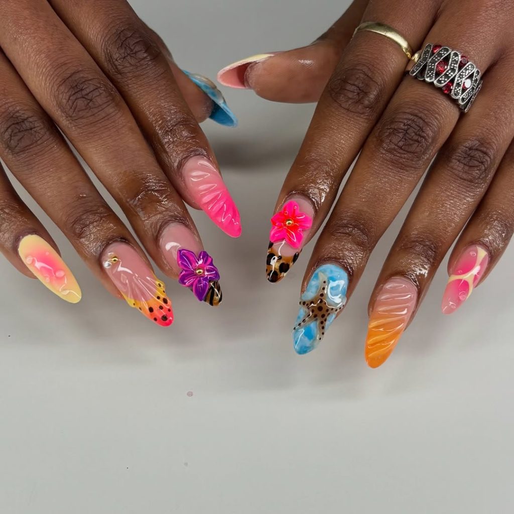 If your mood board is “island nightlife,” this is it. Long stiletto acrylic nails mix sunset gradients, bright florals, a splash of leopard, and a watery blue moment with a starfish detail. The contrast is what makes it editorial: warm pink and orange tones against cool ocean shades, plus glossy depth that looks almost glassy.