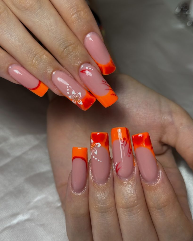 A sharp, modern take on tropical: long square acrylic with nude bases and fiery orange French tips that look sunlit and fresh. The red-orange bloom effect near the edges adds heat, while the white floral detail softens it—like hibiscus energy without going literal. It’s bold but still clean, which makes it easy to wear beyond the beach.