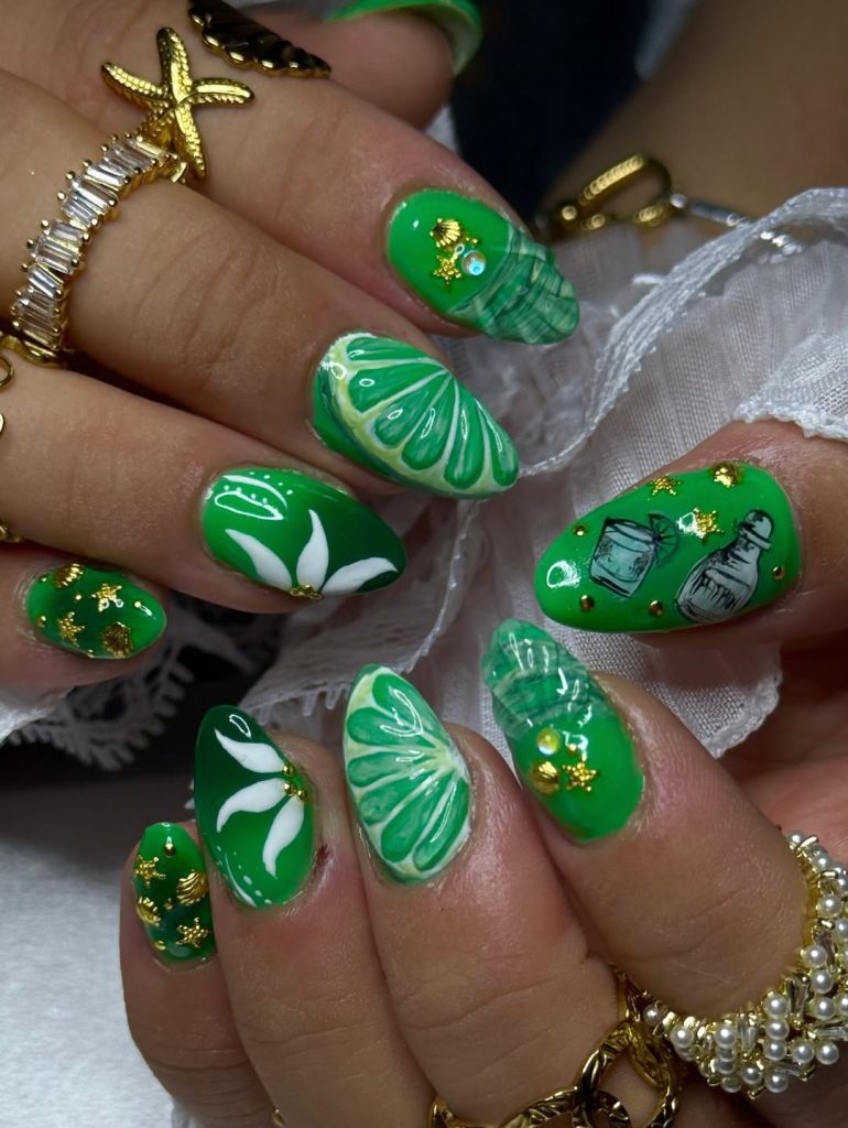This manicure leans playful and beachy with a juicy lime-green palette. The nails mix solid glossy green with hand-painted citrus slice art—translucent segments outlined in white that mimic a fresh-cut lime. On other fingers, soft watercolor-like green marbling adds movement, while gold sea-themed charms (tiny shells/star details) and small pearls give a “resort jewelry” finish. It’s bright, clean, and perfect for summer photos.