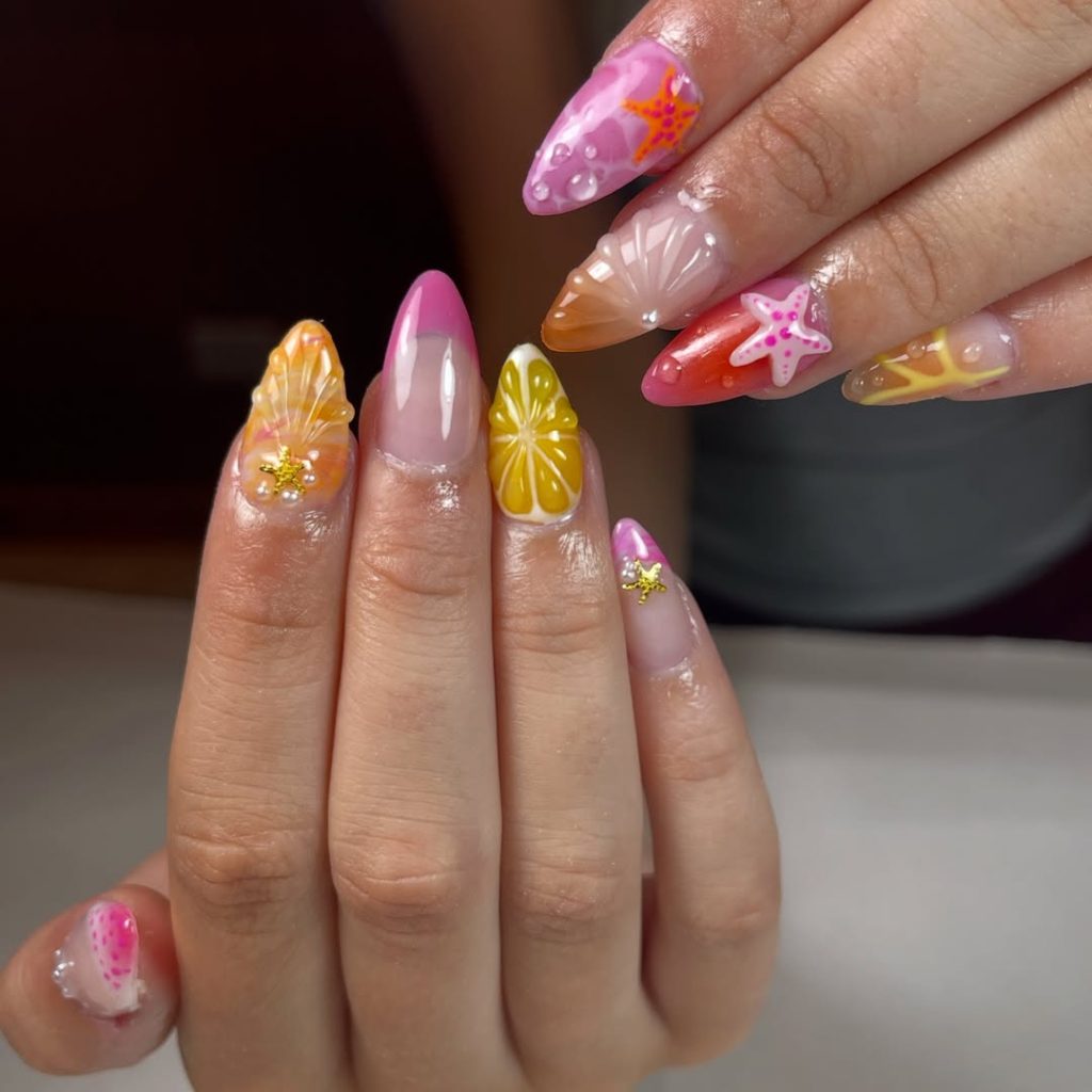 This set looks like a full beach mood board: glossy jelly gradients in pink, orange, and warm coral tones, plus accents that feel straight out of a seaside souvenir shop—in the best way. A raised starfish element appears as a statement detail, while citrus-inspired nail art adds that fresh “cocktail by the pool” vibe. Some nails include a watery droplet effect and sculpted shell-like texture, creating a 3D finish that catches light from every angle.