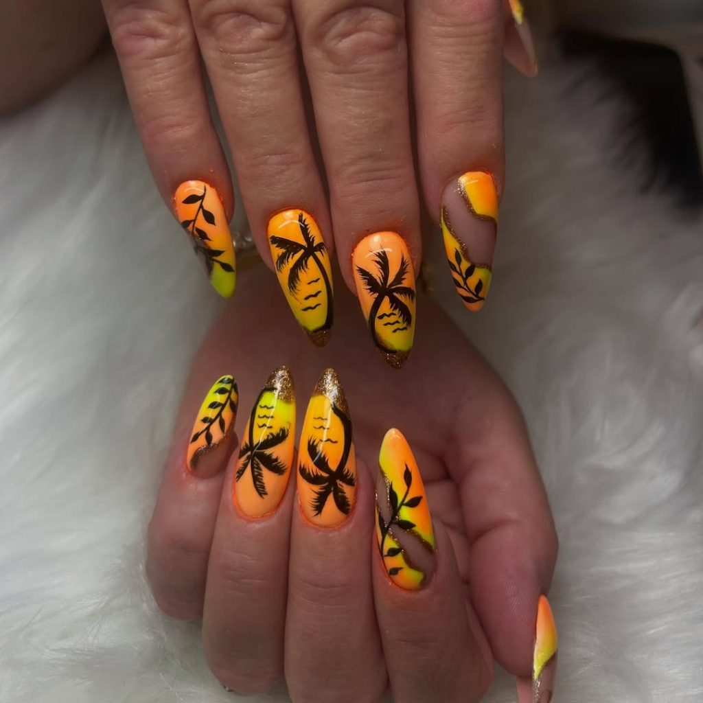Here you get a bold, graphic summer look: long almond nails with a smooth ombré fade from hot orange into bright yellow and neon lime. Over the gradient, crisp black palm tree silhouettes and leafy branches create a sunset postcard effect. A touch of gold glitter at the tips adds extra glow, like sunlight hitting the horizon. This is the kind of manicure that instantly looks like “vacation season,” even with simple outfits.