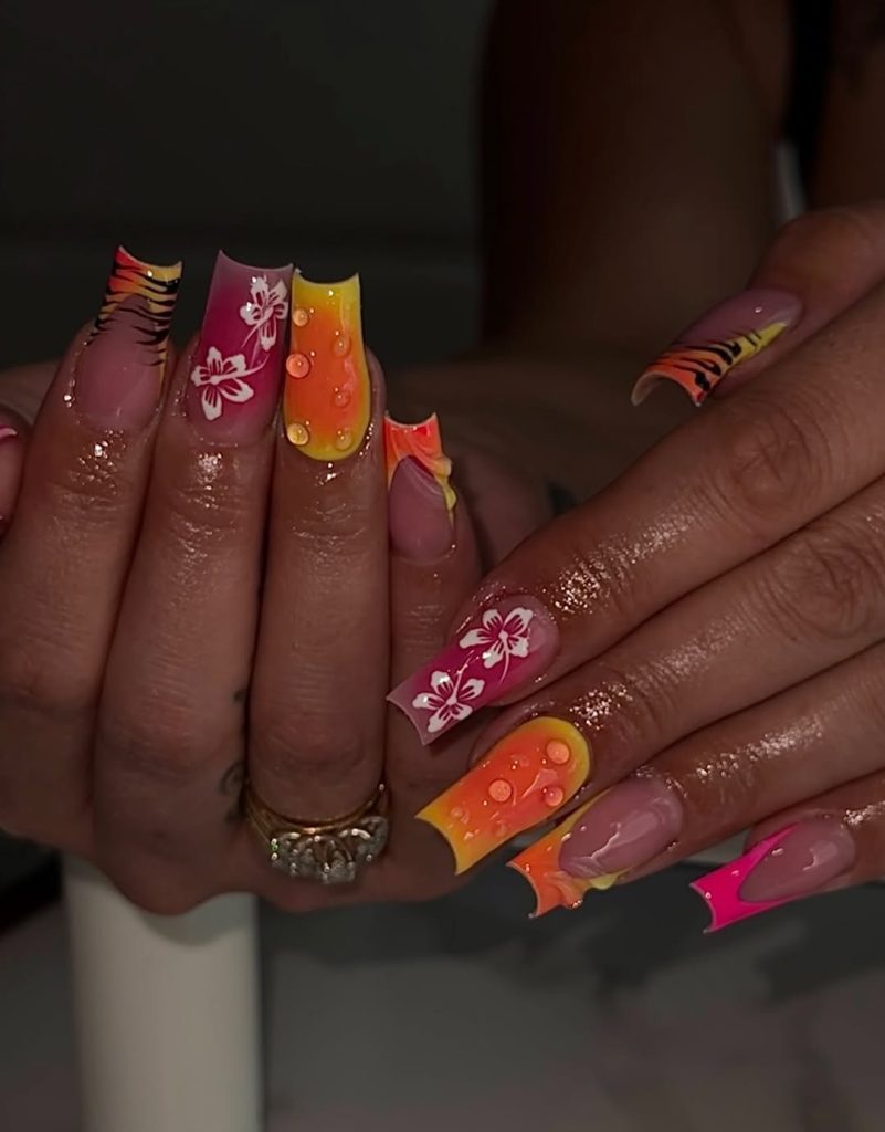 This set plays with shape and color in a really eye-catching way: curved French tips in neon pink, coral, and sunny yellow that create a dramatic “smile line” edge. Over the nude base, white hibiscus-style flowers bloom on accent nails, giving a classic tropical print feel. One nail features glossy water-drop bubbles for a wet-look effect, while striped tip detailing adds a subtle safari/tiger vibe—tropical, bold, and editorial all at once.