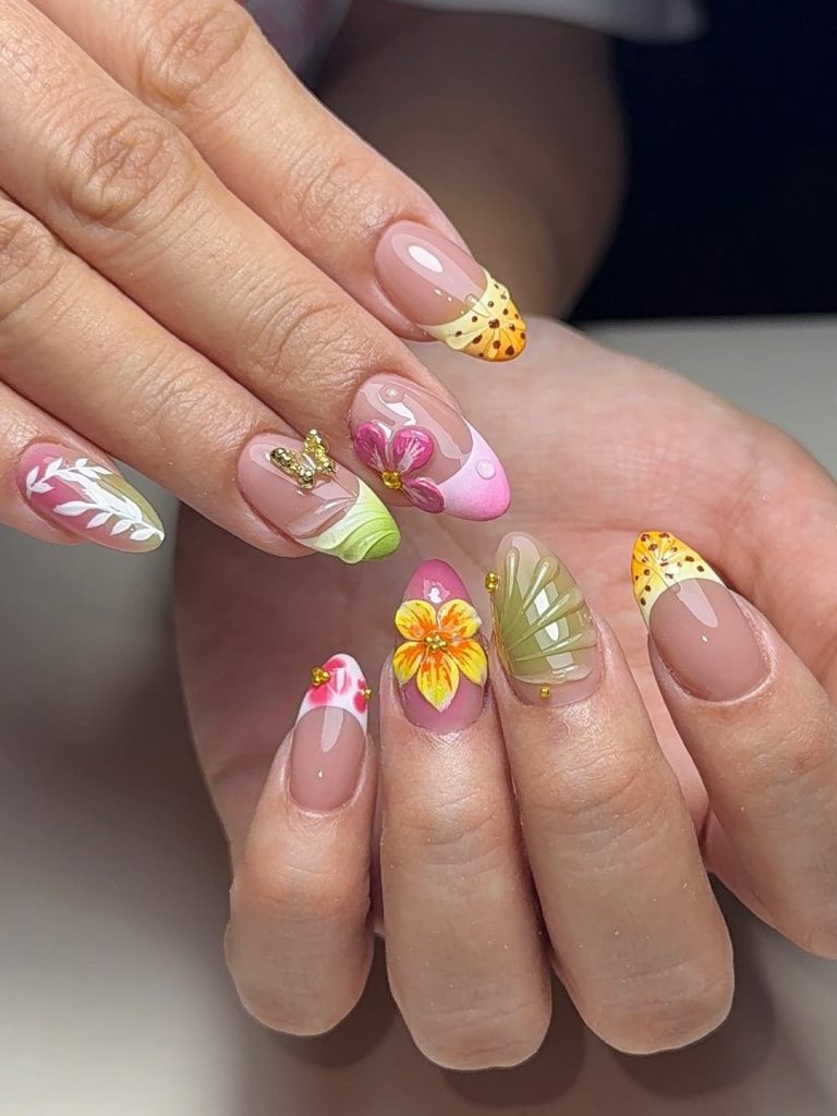 This set is pure vacation energy: a sheer nude base keeps everything airy, while each nail gets its own tropical moment. The standout details are the raised 3D flowers (hibiscus-style petals in warm peach and sunny yellow), tiny pearl dots, and delicate gold accents that catch the light like jewelry. One nail leans beachy with a teal “ocean” tip and soft white swirls, while another brings a playful island vibe with a pink butterfly/flower motif and graphic black striping.