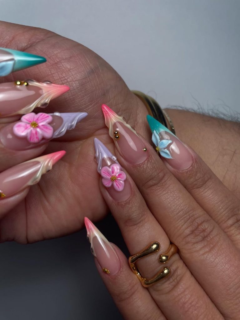 This look leans glam and sculptural. The base is a glossy nude, but the tips are built up with a translucent, “glass-like” effect in soft coral, lilac, and turquoise—almost like melted candy or sea glass. Raised 3D flowers (pink blossoms with tiny gold centers) sit on top like wearable accessories, and small gold studs are placed sparingly to add sparkle without stealing focus.