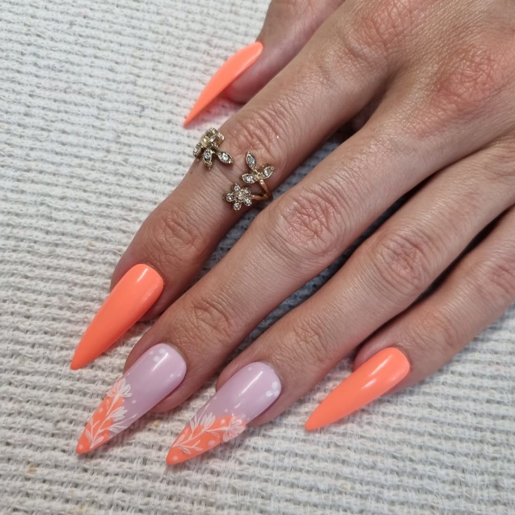 Neon Orange Stiletto Nails With White Botanical Line Art
