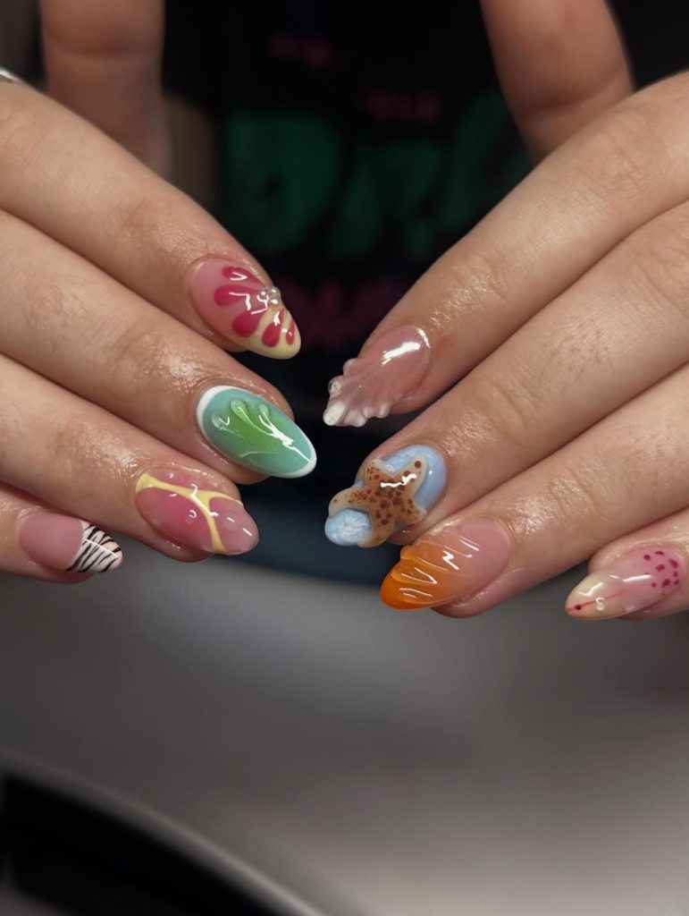 This manicure is pure fun: a mix-and-match set where every nail brings a different summer symbol. You’ve got bright jelly-like colors, a glossy nude base on some fingers, and a standout 3D starfish accent over a watery blue background that feels straight-up seaside. Other nails add graphic details—zebra striping, color-blocking, and painterly swirls—creating that “collected on vacation” aesthetic.