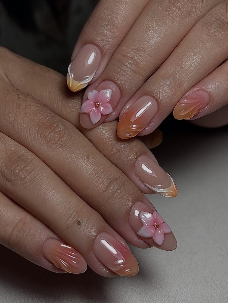 This one is elegant and romantic—like a refined take on summer nails. The base is a glossy nude, while the French tips melt into a warm amber/orange tone that looks like honey or sunset light. The accent nails feature raised 3D pink flowers with tiny gold centers, giving a delicate “petal jewelry” effect. Subtle glossy swirl lines on some nails add dimension without looking busy.