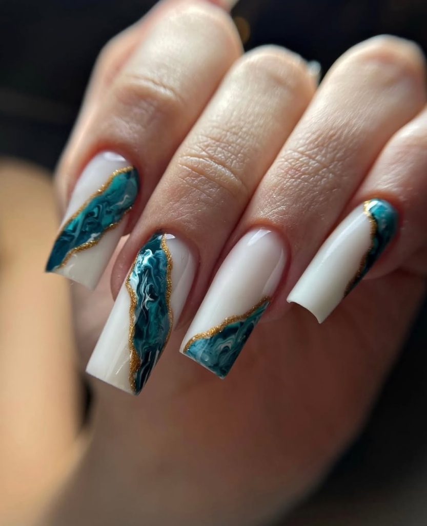 Inspired by the look of natural stones and crystals, it gives you radiant waves of turquoise and emerald green on square nails. Gold veining raises the style to opulence, giving the look extra texture and depth.