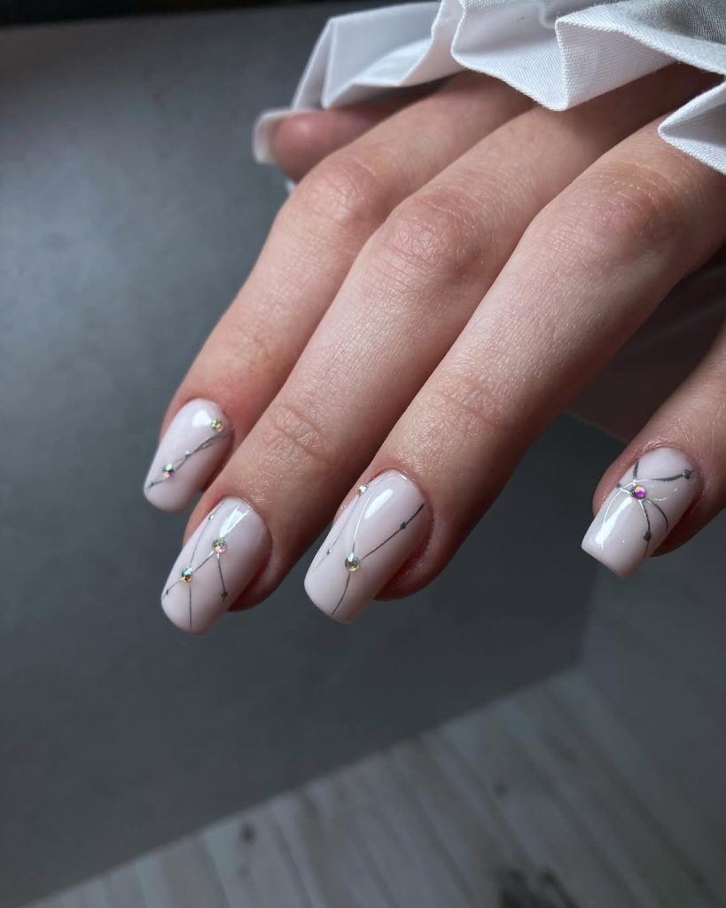 The shape of these square nails is painted light pink and decorated with small rhinestones outlined by finer lines. The effect? A constellation-inspired glam that’s both understated and mesmerizing. It dresses up a regular shape, perfect for using in your presentations at school or in pictures on the weekend.