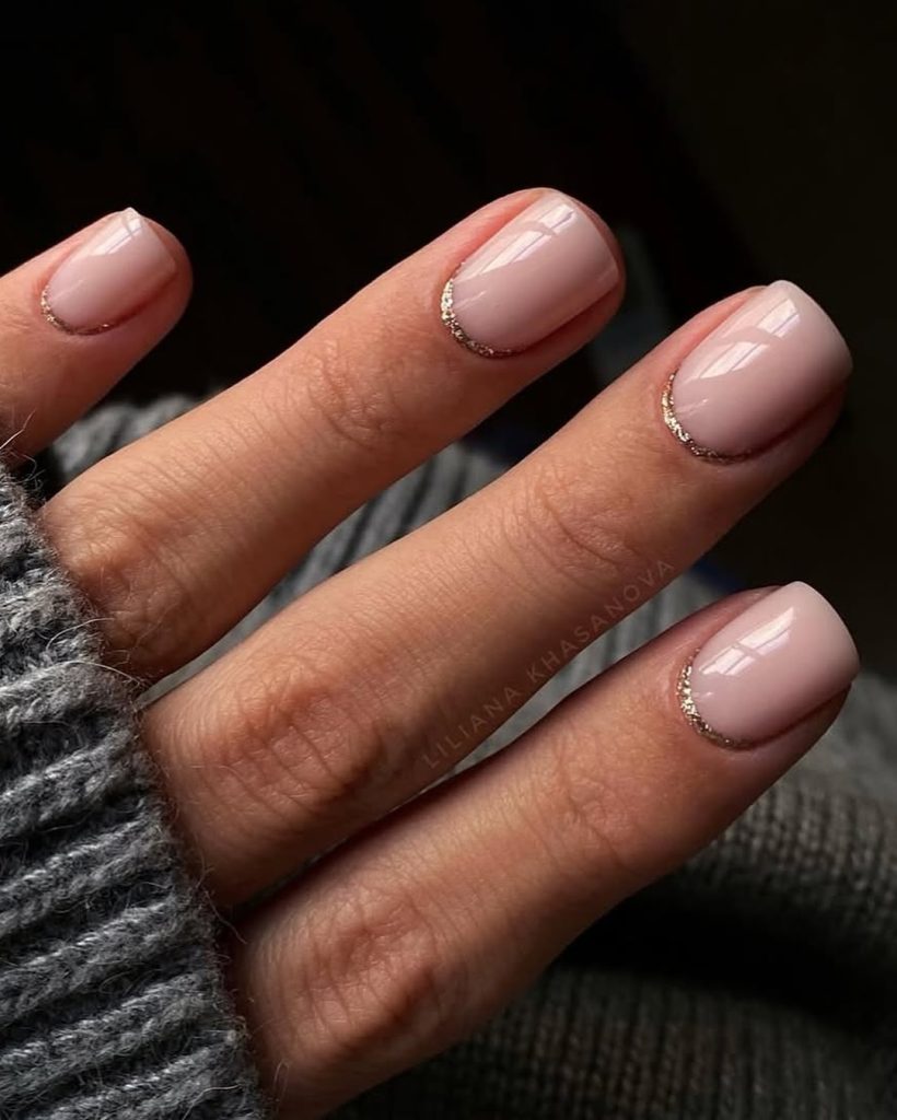 Detailed design was used in this manicure, where a dusty pink main color blends with a splash of golden glitter along the cuticle edge. Having glitter hug your nails offers a magical detail in a more classic appearance. The result is graceful, wearable, and fresh.