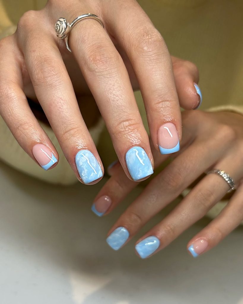 A short but unquestionably impressive nail design, this simple but never boring combination of soft blue solids and florid marble textures can be seen here. It’s a dream choice for people who seek something easy, breezy, but elegant. Everyday, going on vacation, or going to the farmers market.