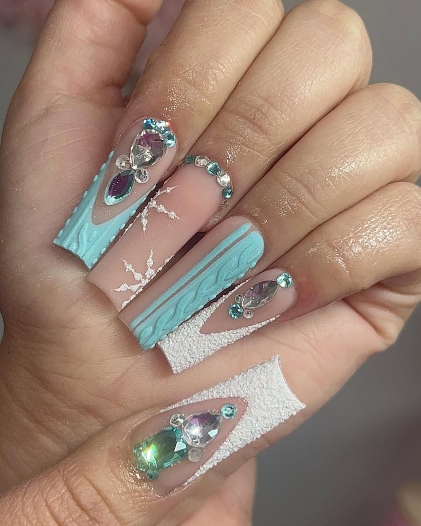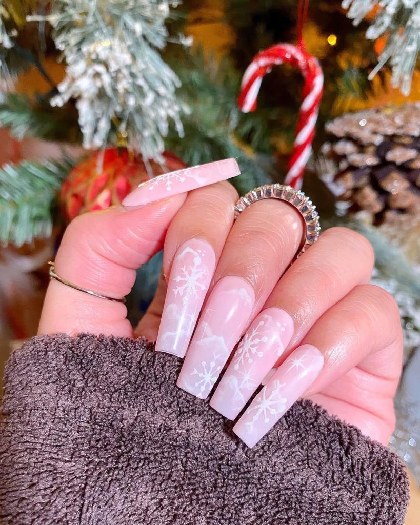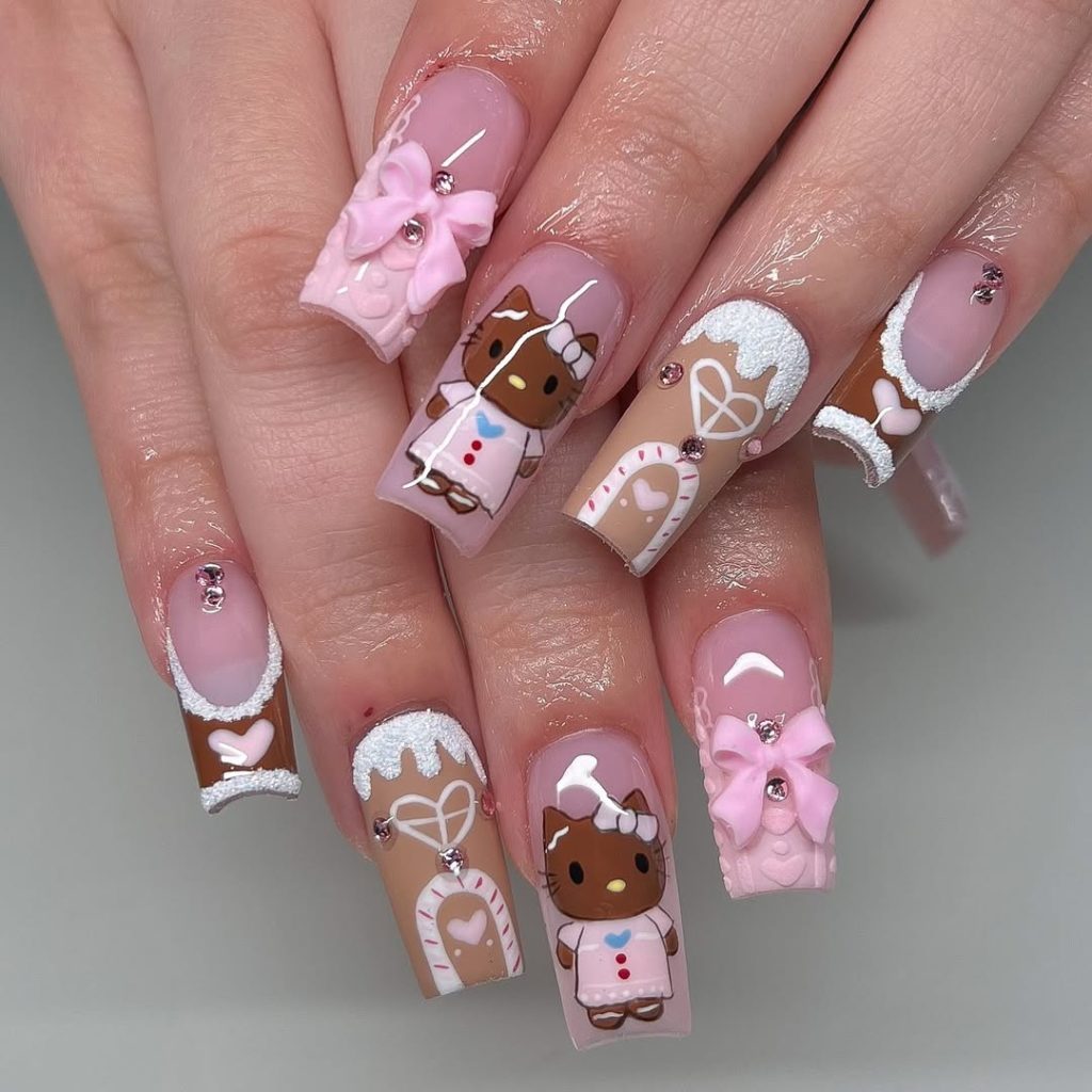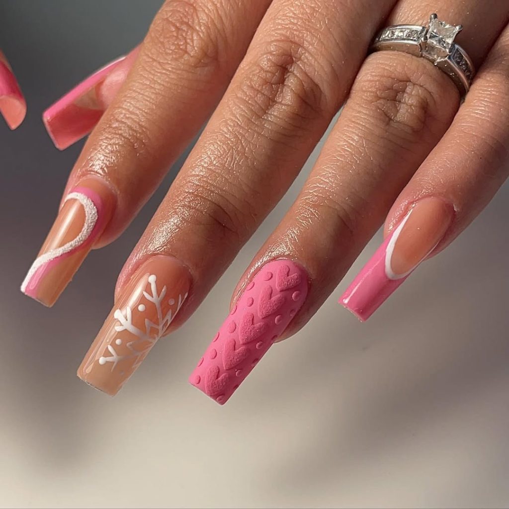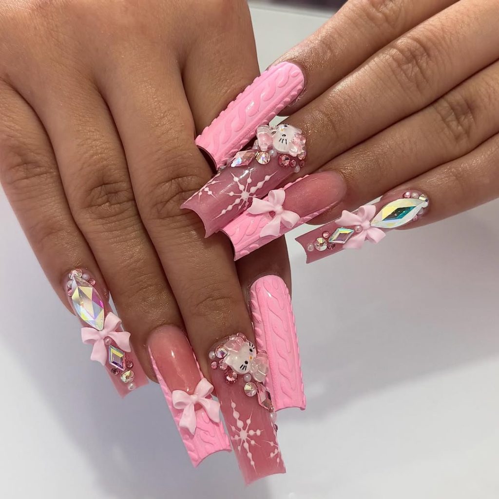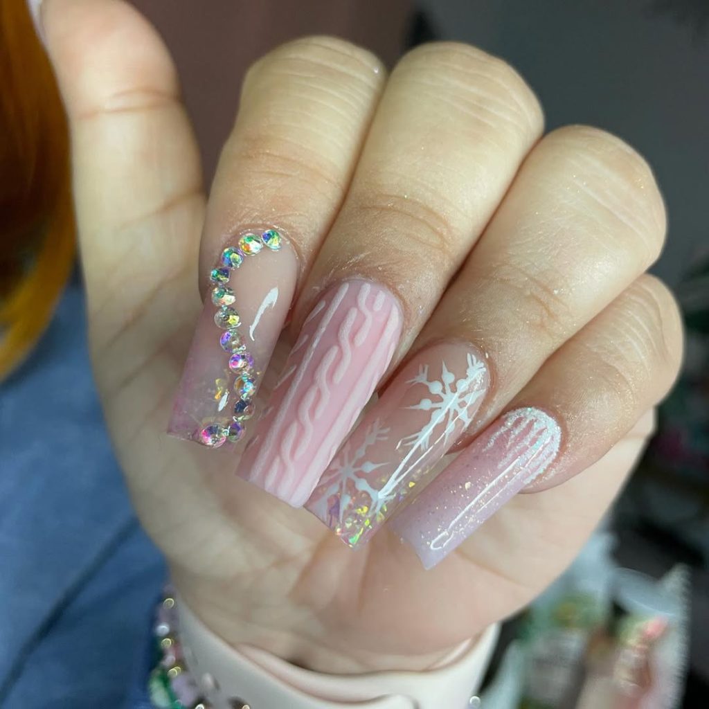Full-on holiday romance: ballerina Pink with raised knit flames, snowy branches, 3D bows, and oversized crystals. The long square shape keeps all that sparkle structured and fashion-editor chic.Why it works: Monochrome Pink plus clear stones feels luxe, not busy.