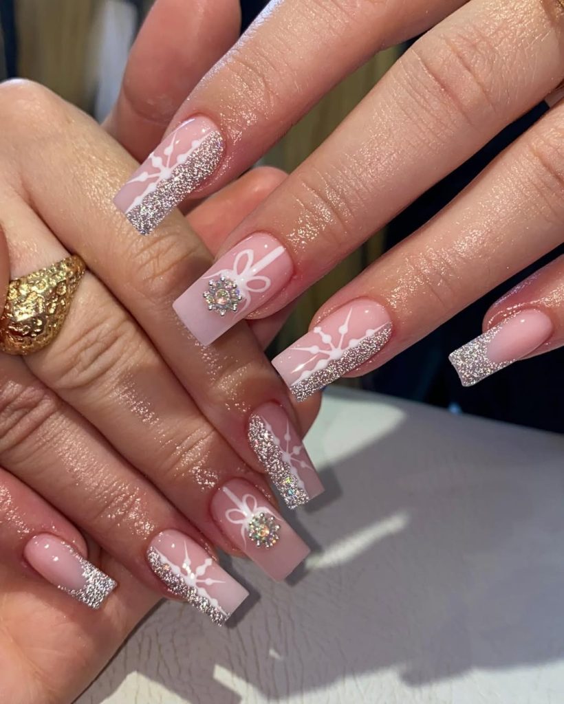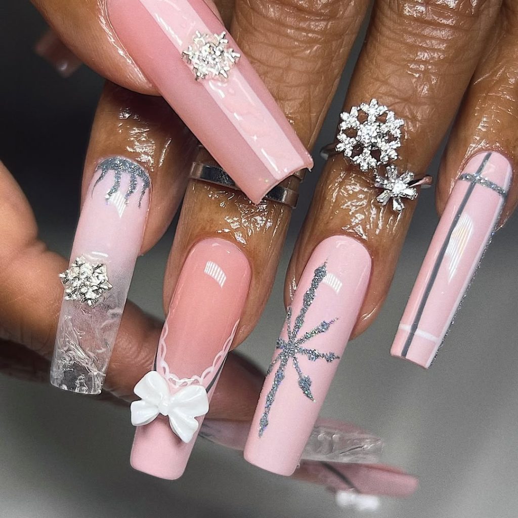 Glossy ballet Pink gets the luxe treatment: silver-lined panels, snowflake studs, and tiny sculpted bows. The Long square length and high shine keep it fashion-forward and unapologetically feminine.