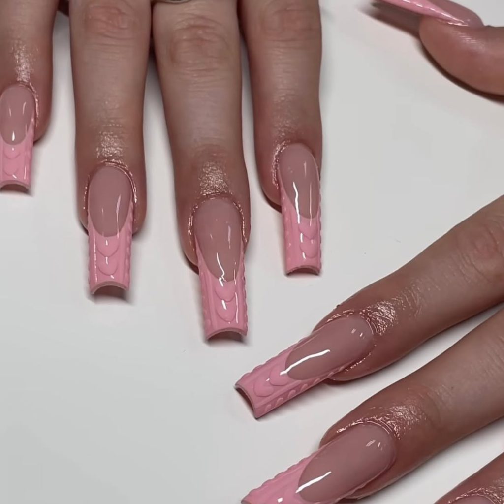 If you love a Minimalistic vibe, this knit-texture French is your holiday uniform. A semi-sheer neutral base flows into sculpted Pink cable-knit tips, all in a sleek long square. It’s tactile without being busy—think elevated ski-lodge energy that plays well with cream cashmere and structured blazers.