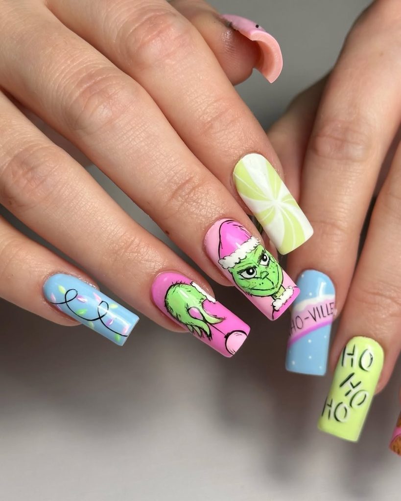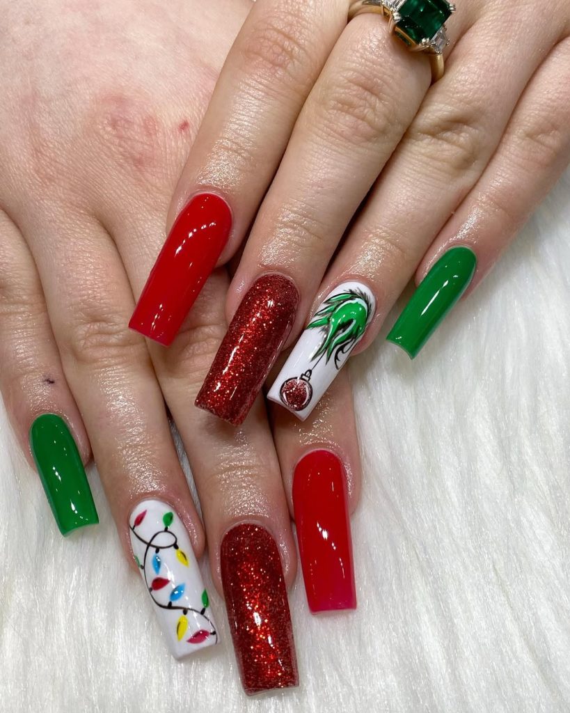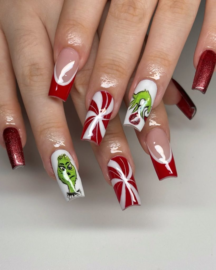 Holiday-core, refined: alternating glossy Red French and spinning peppermint targets in White, punctuated by a cheeky Green Grinch portrait. A couple of deep red shimmer nails add sophisticated glitter payoff.Why it works: The round peppermint forms counter the straight edges of the square, creating balance.